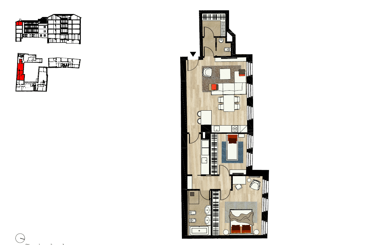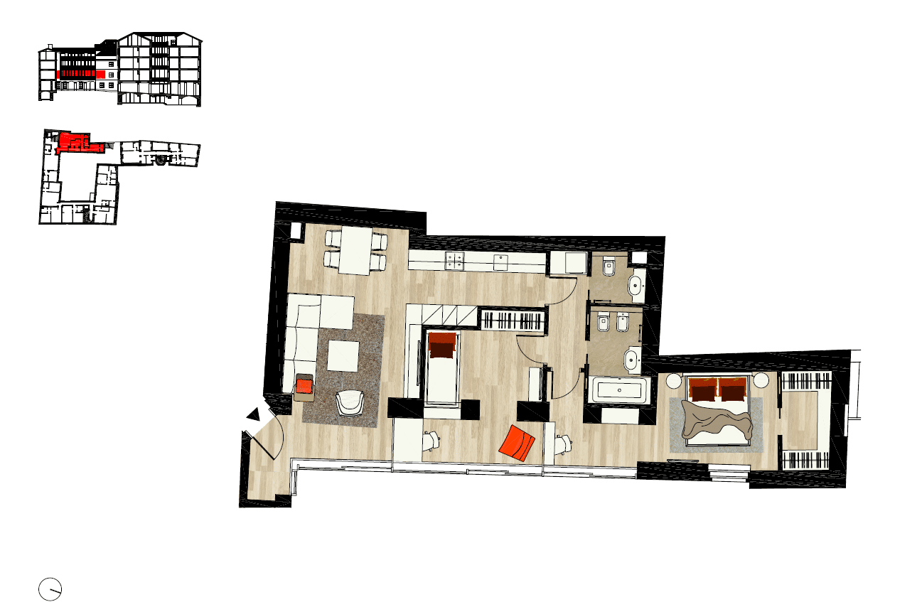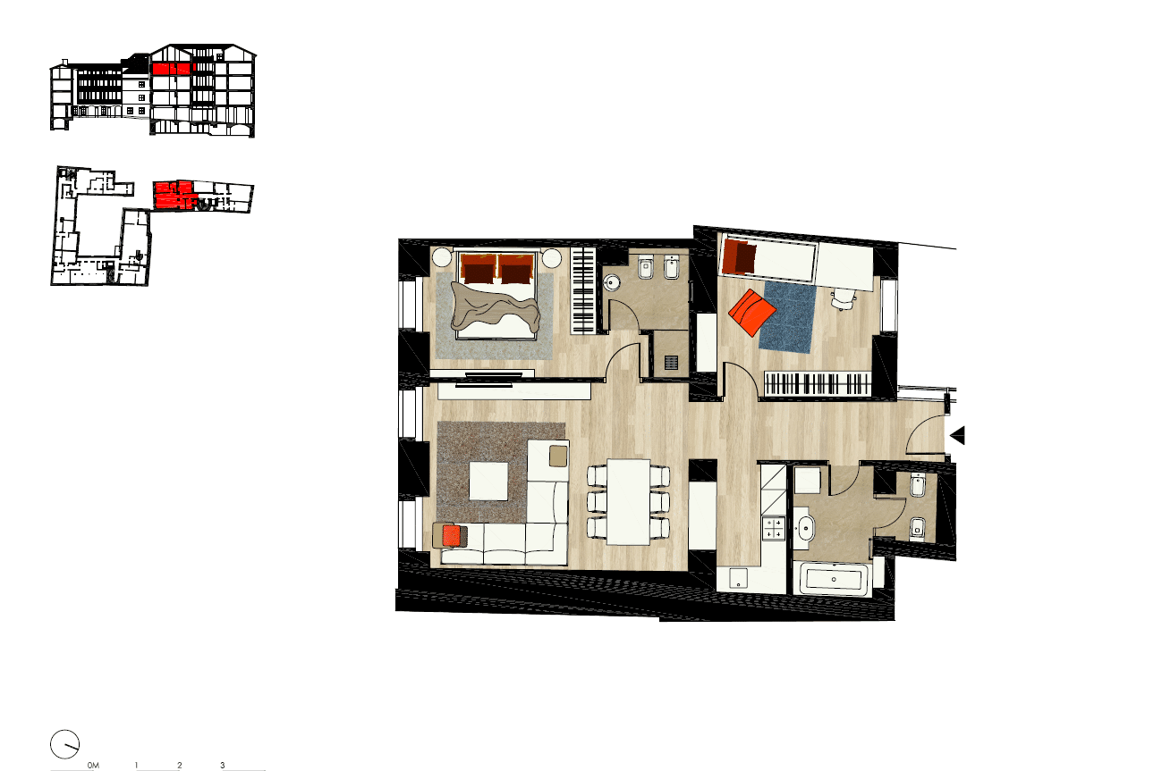 הפילוסופיה שעומדת מאחורי הבניין מתבטאת בפעילות השימור בכל חלקיו תוך הערכת אופיו ההיסטורי והארכיטקטוני. תשומת לב מיוחדת הוענקה לנוחות ולעיצוב החללים. מרפסות הזכוכית הגדולות בחצר עוצבו למטרה זו. החצר הפנימית גם מהווה נקודת התייחסות של הפרויקט כאלמנט של הטענת מצברים וכמקום התבודדות.